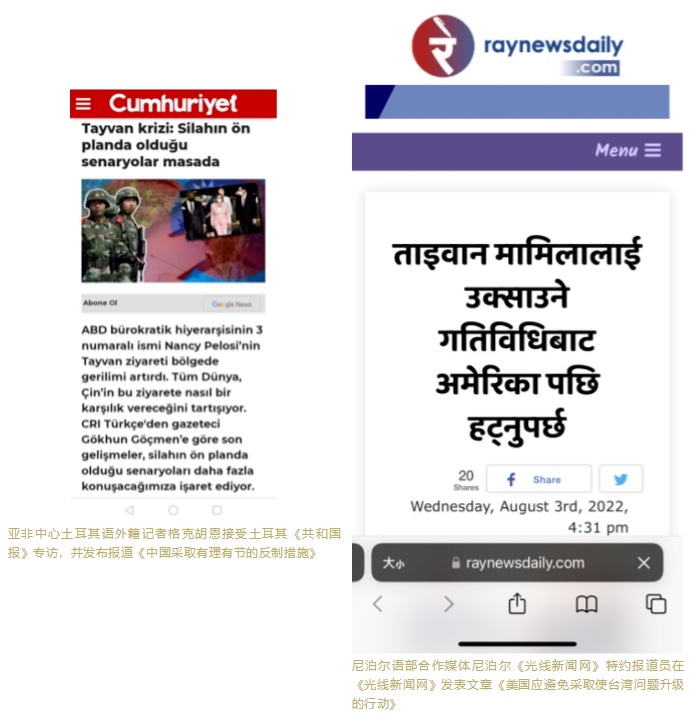 亞非中心土耳其、希伯來語、豪薩語、尼泊爾語、蒙古語等多語種主播、評論員和網(wǎng)紅積極在多家外媒發(fā)聲,接受了包括以色列電視臺、土耳其AHABER新聞臺、土耳其TGRT電視臺、土耳其新聞電視臺等多家國際媒體的采訪連線,同時多名外籍記者、海外特約評論員在尼日利亞《領導者報》網(wǎng)站、尼泊爾《光線新聞網(wǎng)》、肯尼亞《人民報》、蒙古國媒體SONIN.MN等對象國主流媒體發(fā)表評論及署名文章,對外闡釋中方立場和反制措施的合理性、正當性,介紹臺灣問題歷史經(jīng)緯,揭批美國在臺灣問題上的背信棄義。