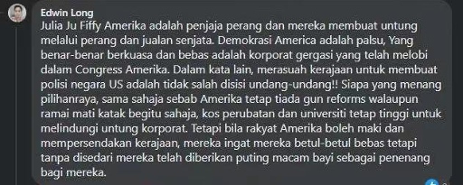 馬來西亞網(wǎng)友Edwin Long留言:“美國就是戰(zhàn)爭販子,他們通過戰(zhàn)爭和販賣武器獲利。美國的民主只是假象,真正享有權(quán)力和自由的是在幕后主導國會的大企業(yè)。換句話說,官商勾結(jié)在美國的法律上是被允許的!無論誰贏得選舉,一樣不會禁槍,醫(yī)療和教育成本還是不會下降,因為要維護大企業(yè)的利益。但是他們的人民覺得他們能罵政府就是自由的,全然沒有意識到這不過是安撫奶嘴罷了?!?/p>