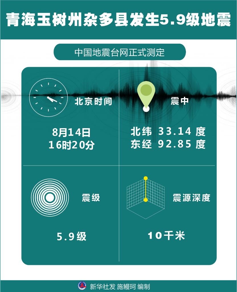 新華社西寧8月14日電(記者陳杰、王艷)記者從青海省地震局獲悉,8月14日16時(shí)20分,青海省玉樹藏族自治州雜多縣發(fā)生5.9級(jí)地震,震源深度10千米,震中位于北緯33.14度、東經(jīng)92.85度。目前,暫無人員傷亡消息。