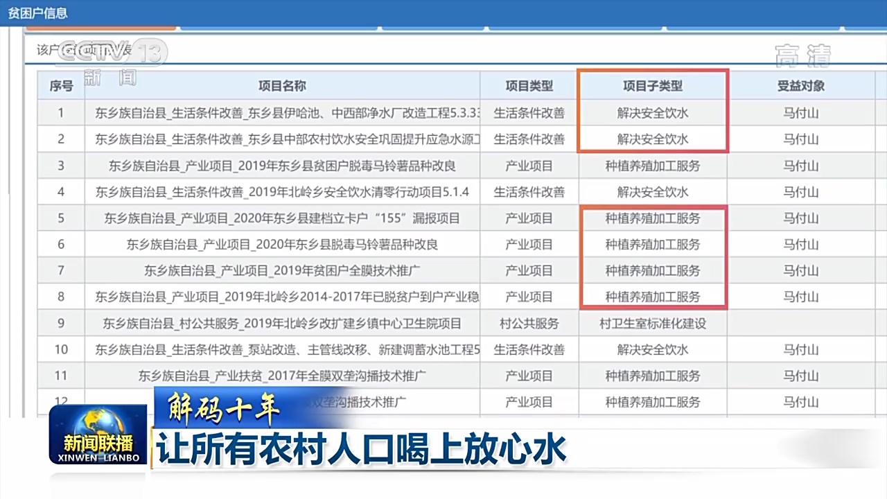 水能解渴,更能致富。在全國扶貧開發(fā)信息系統(tǒng)中,我們找到了過去十年中“因水致貧”的家庭。當(dāng)我們查詢這些貧困戶的脫貧措施和鞏固提升措施,可以看到“解決安全飲水”和“特色種植、養(yǎng)殖產(chǎn)業(yè)”總會同時出現(xiàn)。