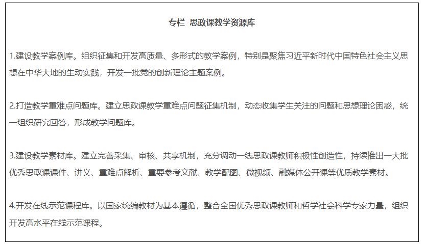 19.全面推進(jìn)課程思政高質(zhì)量建設(shè)。教育部組建高等學(xué)校課程思政教學(xué)指導(dǎo)委員會,研制普通本科專業(yè)類課程思政教學(xué)指南,組織開展高校教師課程思政教學(xué)能力培訓(xùn),建設(shè)一批課程思政系列共享資源庫。建成一批課程思政示范高校,推出一批課程思政示范課程,選樹一批課程思政教學(xué)名師和團(tuán)隊,建設(shè)一批高校課程思政教學(xué)研究示范中心。加強(qiáng)中小學(xué)學(xué)科德育建設(shè)。