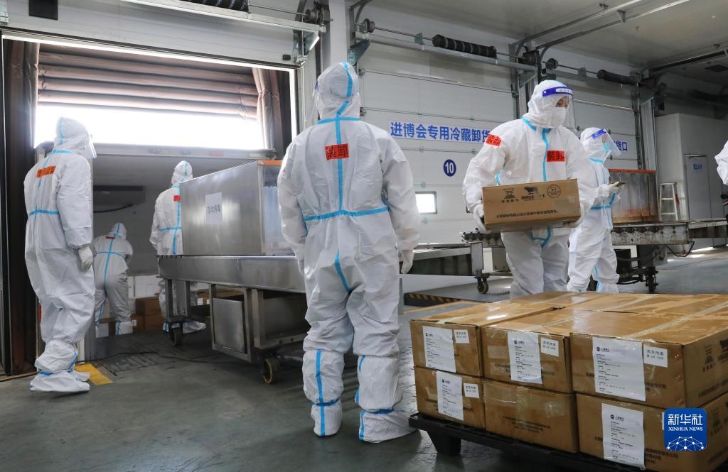 記者在現(xiàn)場(chǎng)看到,當(dāng)運(yùn)輸進(jìn)口冷鏈?zhǔn)称氛蛊返能囕v到達(dá)后,工作人員馬上對(duì)司機(jī)進(jìn)行健康碼核驗(yàn)和體溫檢測(cè),并對(duì)車輛進(jìn)行消毒。裝卸過程中,司機(jī)實(shí)行“非必要不下車”。貨物入庫(kù)時(shí),在完成外包裝消毒后,工作人員將展品拆除外包裝,對(duì)內(nèi)里的小包裝進(jìn)行消毒、核酸檢測(cè),再重新裝箱、貼標(biāo)簽、放入暫存庫(kù),之后再轉(zhuǎn)入合格儲(chǔ)存庫(kù)。