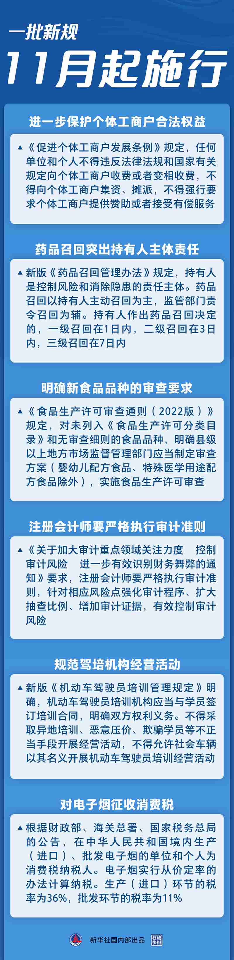 這個(gè)11月,一批民生新規(guī)開始施行,影響社會生活諸多方面。保護(hù)個(gè)體工商戶合法權(quán)益、規(guī)范駕培機(jī)構(gòu)經(jīng)營活動(dòng)、完善藥品召回分級制度……更完善的法治,讓你我更有獲得感。