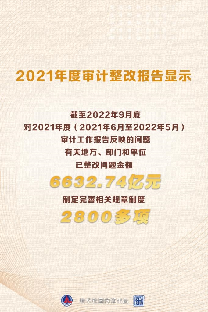 新華社北京12月28日電(記者鄒多為)報告顯示,截至2022年9月底,對于2021年度(2021年6月至2022年5月)審計工作報告反映的問題,有關(guān)地方、部門和單位已整改問題金額6632.74億元,制定完善相關(guān)規(guī)章制度2800多項,追責問責1.4萬人,糾治了一些阻礙改革發(fā)展和長期未解決的頑瘴痼疾。