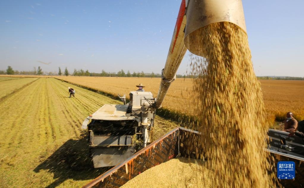 山東省臨沂市郯城縣郯城街道農(nóng)民將收獲的水稻裝車(chē)(2022年10月23日攝)。新華社發(fā)(張春雷 攝)