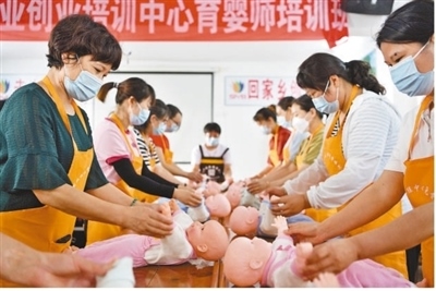 湖北省襄陽(yáng)市??悼h就業(yè)創(chuàng)業(yè)培訓(xùn)中心,學(xué)員在育嬰師培訓(xùn)班上練習(xí)新生兒護(hù)理技能。楊 韜攝(影像中國(guó))