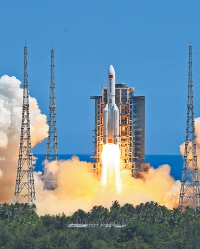 搭載問天實(shí)驗(yàn)艙的長征五號B遙三運(yùn)載火箭,在海南文昌航天發(fā)射場點(diǎn)火發(fā)射。 新華社記者 李 剛攝