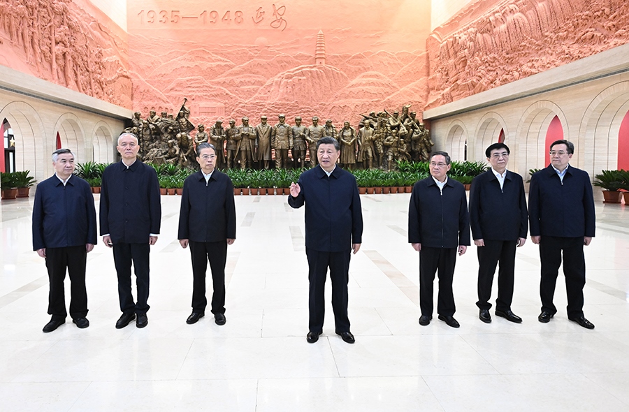 2022年10月27日,中共中央總書記、國家主席、中央軍委主席習(xí)近平帶領(lǐng)中共中央政治局常委李強、趙樂際、王滬寧、蔡奇、丁薛祥、李希,瞻仰延安革命紀念地。這是習(xí)近平在延安革命紀念館參觀《偉大歷程——中共中央在延安十三年歷史陳列》結(jié)束時發(fā)表重要講話。 新華社記者 燕雁/攝