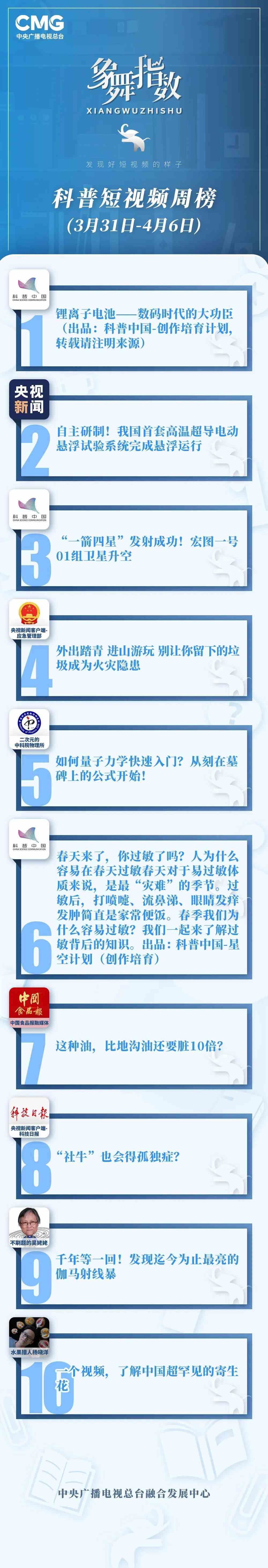 中央廣播電視總臺(tái)“象舞指數(shù)”評(píng)議品牌,推出科普短視頻周榜、總臺(tái)科普短視頻周榜。在2023年3月31日-4月6日,值得注目的內(nèi)容有: