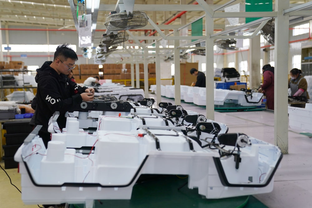 3月16日,工人在河北省邢臺(tái)經(jīng)濟(jì)開(kāi)發(fā)區(qū)一家外貿(mào)企業(yè)生產(chǎn)車間組裝童車產(chǎn)品。新華社記者 駱學(xué)峰 攝
