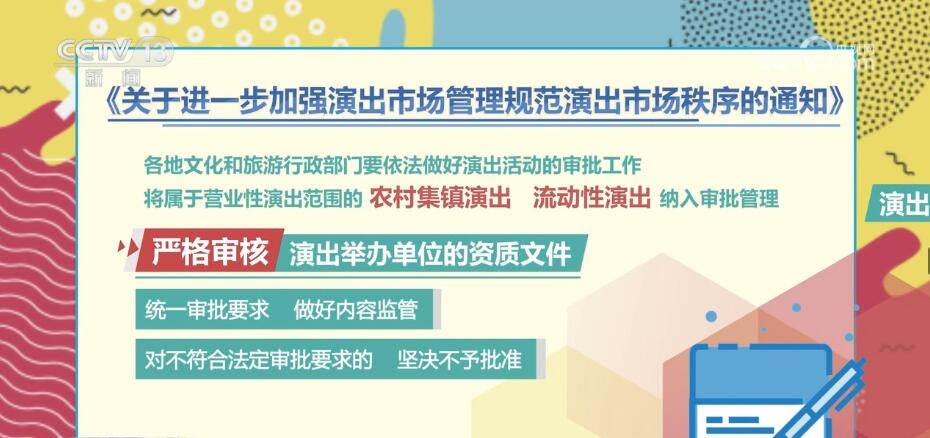 通知指出,各地文化和旅游行政部門要依法做好演出活動(dòng)的審批工作,將屬于營業(yè)性演出范圍的農(nóng)村集鎮(zhèn)演出、流動(dòng)性演出納入審批管理,嚴(yán)格審核演出舉辦單位的資質(zhì)文件,統(tǒng)一審批要求,做好內(nèi)容監(jiān)管。對(duì)不符合法定審批要求的,堅(jiān)決不予批準(zhǔn)。文化和旅游行政部門要定期對(duì)演出場所進(jìn)行檢查,督促演出場所定期開展設(shè)施設(shè)備檢查,落實(shí)安全生產(chǎn)責(zé)任制。督促演出場所建立完善現(xiàn)場巡查制度,指定專人負(fù)責(zé)演出活動(dòng)的巡查,做好現(xiàn)場觀眾管理,堅(jiān)決防止擁擠、踩踏等事故發(fā)生,確保演出現(xiàn)場安全。各地文化和旅游行政部門要將社會(huì)關(guān)注度高、票務(wù)供需緊張的營業(yè)性演出作為重點(diǎn)監(jiān)管對(duì)象,提前進(jìn)行研判。督促演出舉辦單位、演出票務(wù)經(jīng)營單位面向市場公開銷售的營業(yè)性演出門票數(shù)量,不得低于核準(zhǔn)觀眾數(shù)量的70%。對(duì)在票務(wù)經(jīng)營中發(fā)現(xiàn)有炒票問題或可能造成不良影響的,應(yīng)當(dāng)及時(shí)約談演出舉辦單位和演出票務(wù)經(jīng)營單位,督促整改。要聯(lián)合屬地公安、市場監(jiān)管等部門,依法打擊“黃?!背雌?、虛假宣傳等違法違規(guī)行為,切實(shí)保障消費(fèi)者合法權(quán)益。