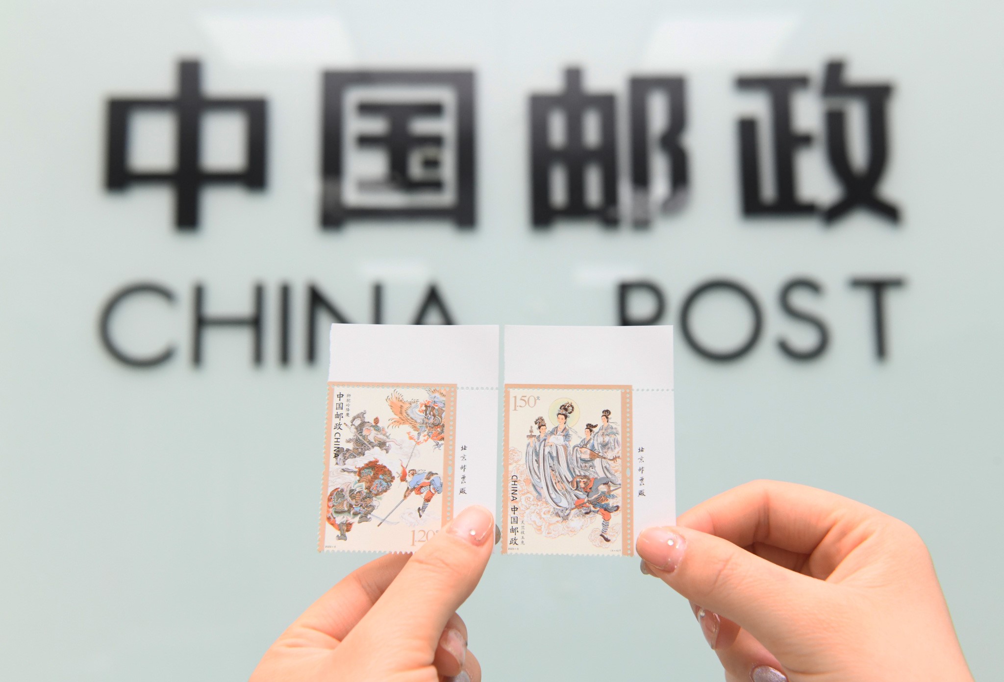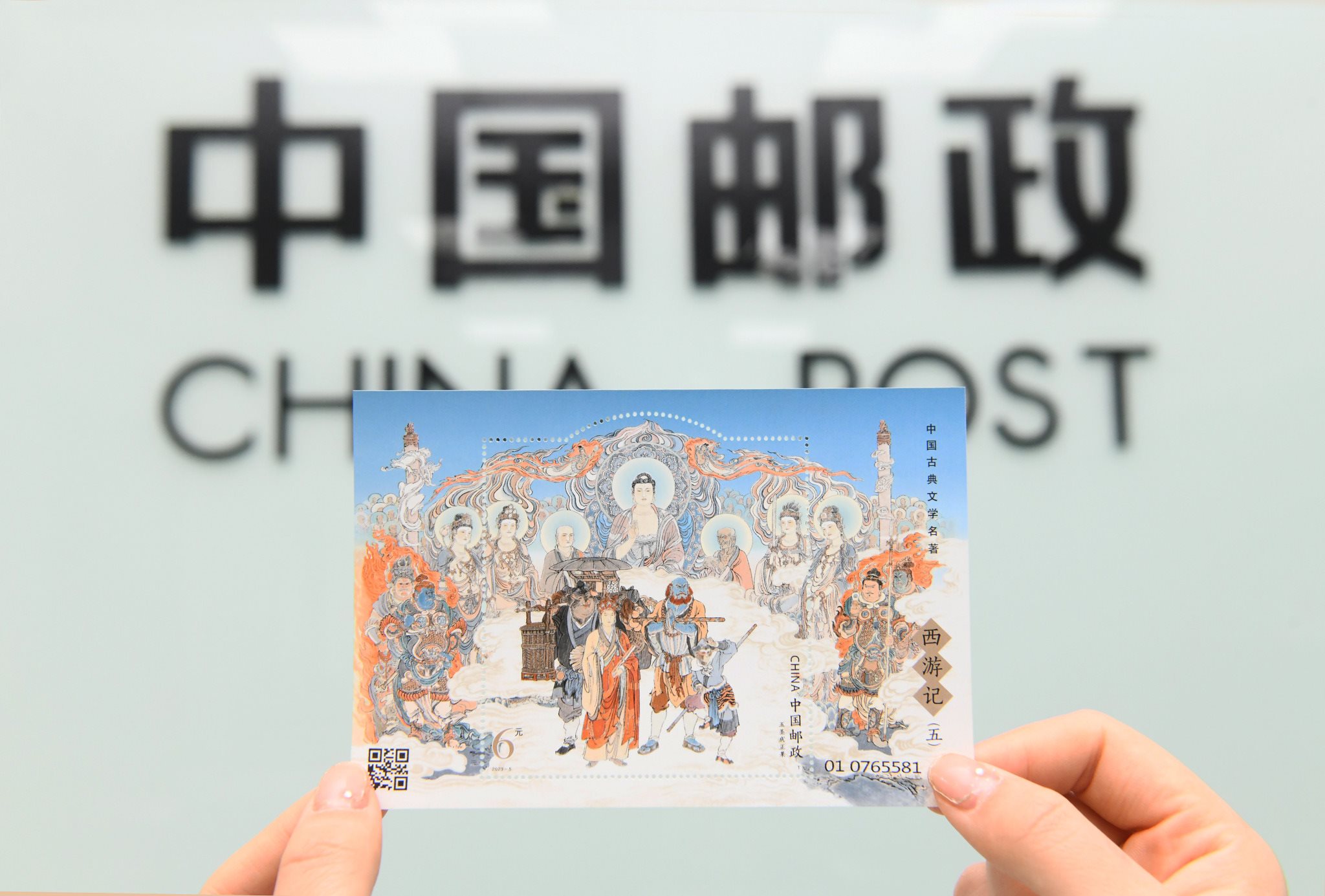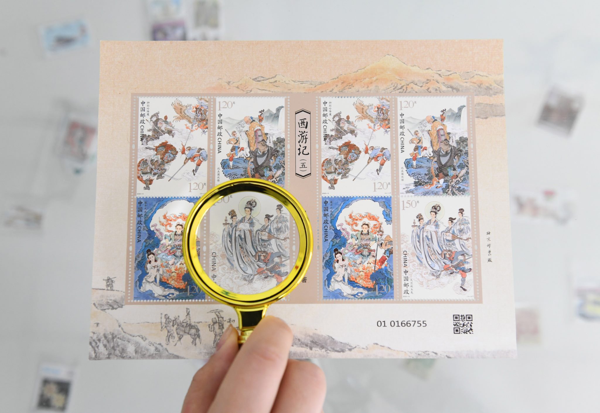 2023年4月27日,中國郵政集團公司河北省新樂市分公司,工作人員展示發(fā)行的《中國古典文學名著—<西游記>(五)》特種郵票。視覺中國