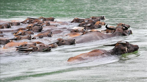 四川南充嘉陵江放牛季活動啟幕,上演“百牛渡江”場面。