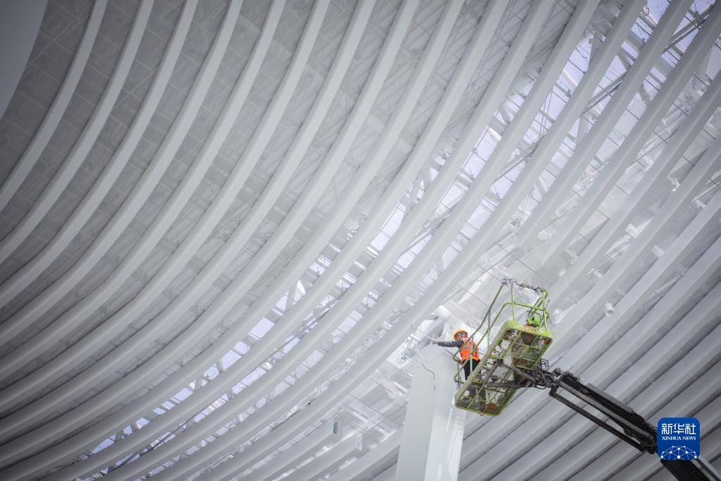 5月1日,在中建三局承建的武漢天河機(jī)場(chǎng)T2航站樓改造工程項(xiàng)目工地,工人在檢查吊頂內(nèi)管線。