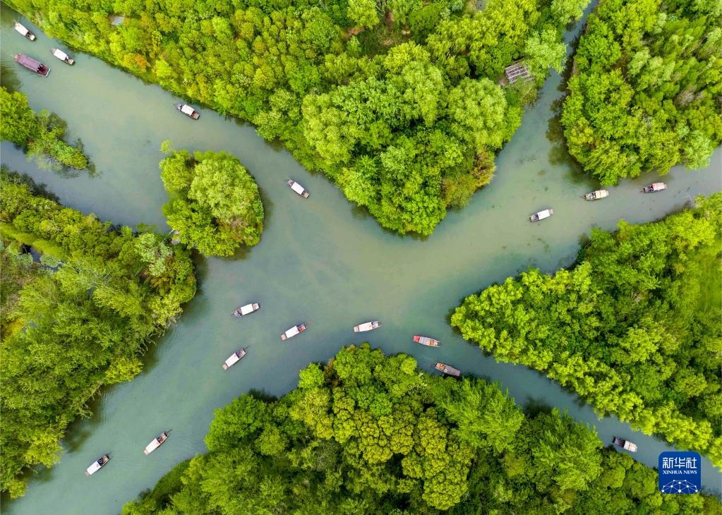 5月2日,游客在江蘇省泰州市姜堰區(qū)溱湖國家濕地公園內乘坐搖櫓船游玩(無人機照片)。
