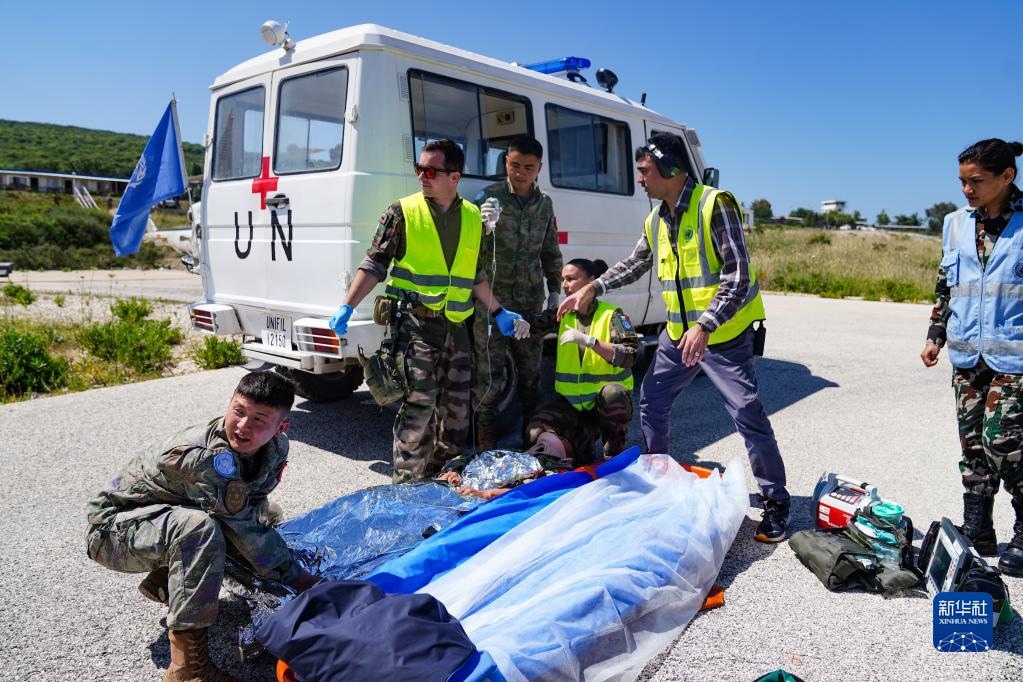 5月3日,在黎巴嫩南部邊境“藍(lán)線”附近雷場(chǎng),參與演習(xí)的中國第21批赴黎巴嫩維和多功能工兵分隊(duì)隊(duì)員同外軍醫(yī)療分隊(duì)交接。