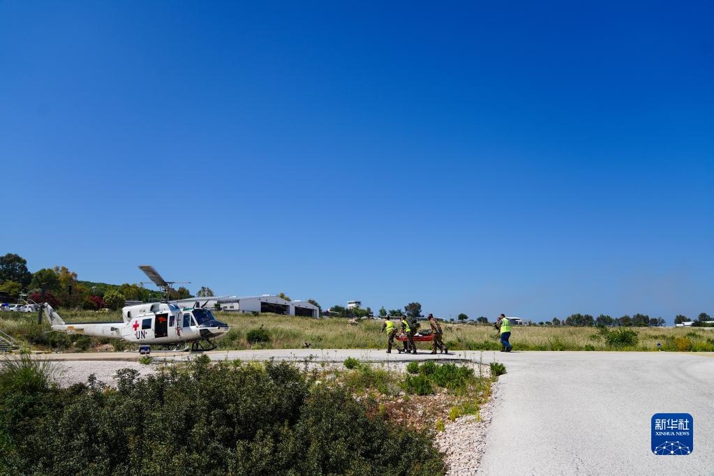 5月3日,在黎巴嫩南部邊境“藍(lán)線”附近雷場(chǎng),參與演習(xí)的中國第21批赴黎巴嫩維和多功能工兵分隊(duì)隊(duì)員使用救援直升機(jī)轉(zhuǎn)運(yùn)“傷員”。