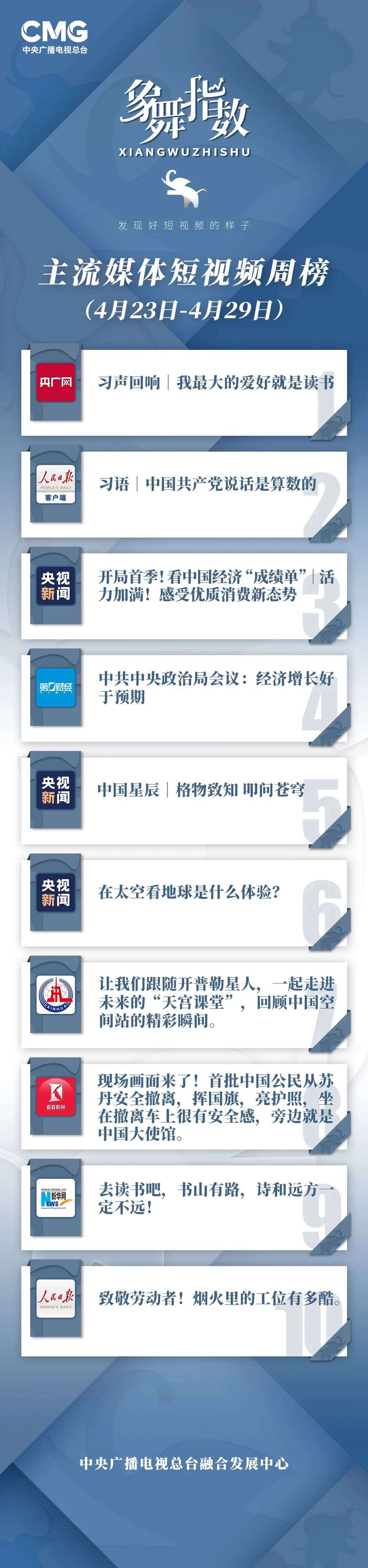 中央廣播電視總臺“象舞指數(shù)”評議品牌,推出主流媒體短視頻周榜、總臺短視頻周榜。在2023年4月23日—4月29日,這些內(nèi)容引發(fā)大眾關(guān)注:
