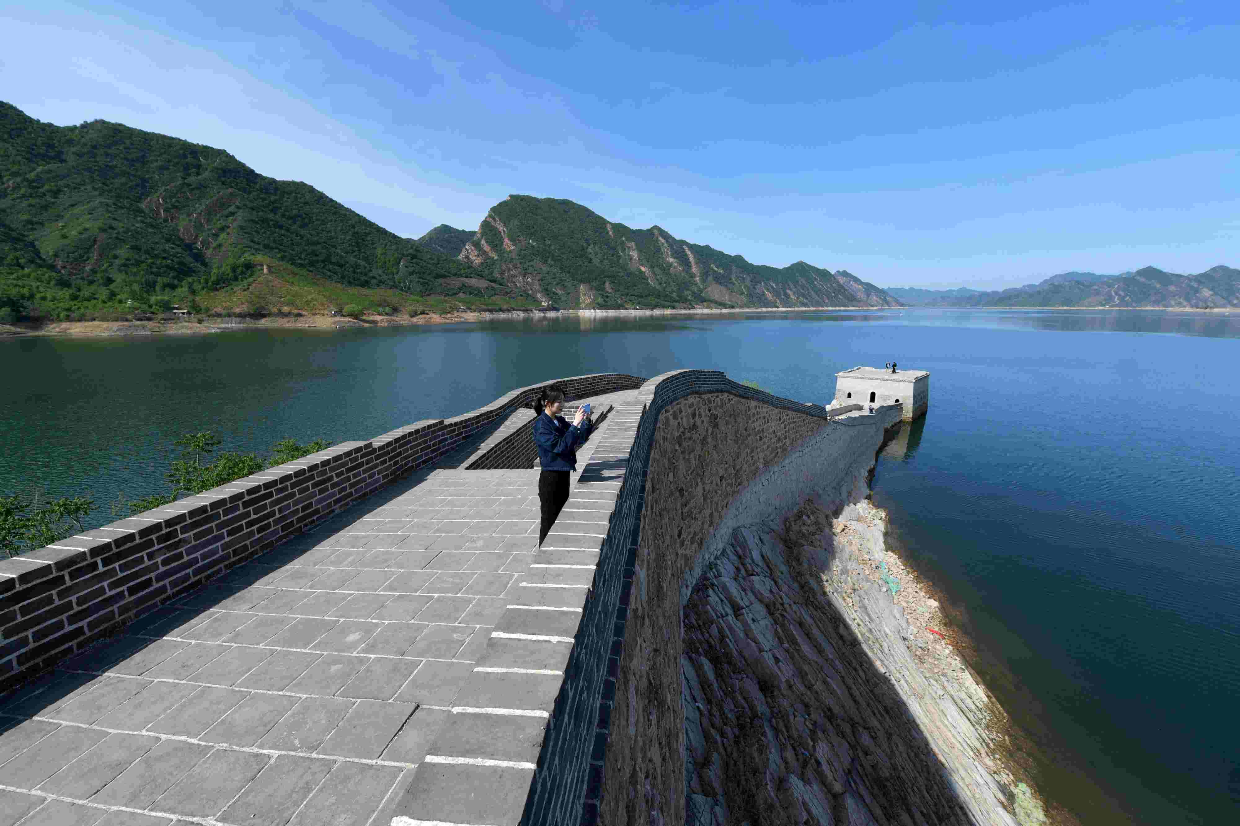 2023年5月8日,河北承德,寬城滿族自治縣境內(nèi)潘家口水庫的“水下長城”。這段“水下長城”是明長城的遺址,20世紀(jì)70年代因建設(shè)水利樞紐工程,部分長城隱沒水下,從而形成“水下長城”景觀。 視覺中國