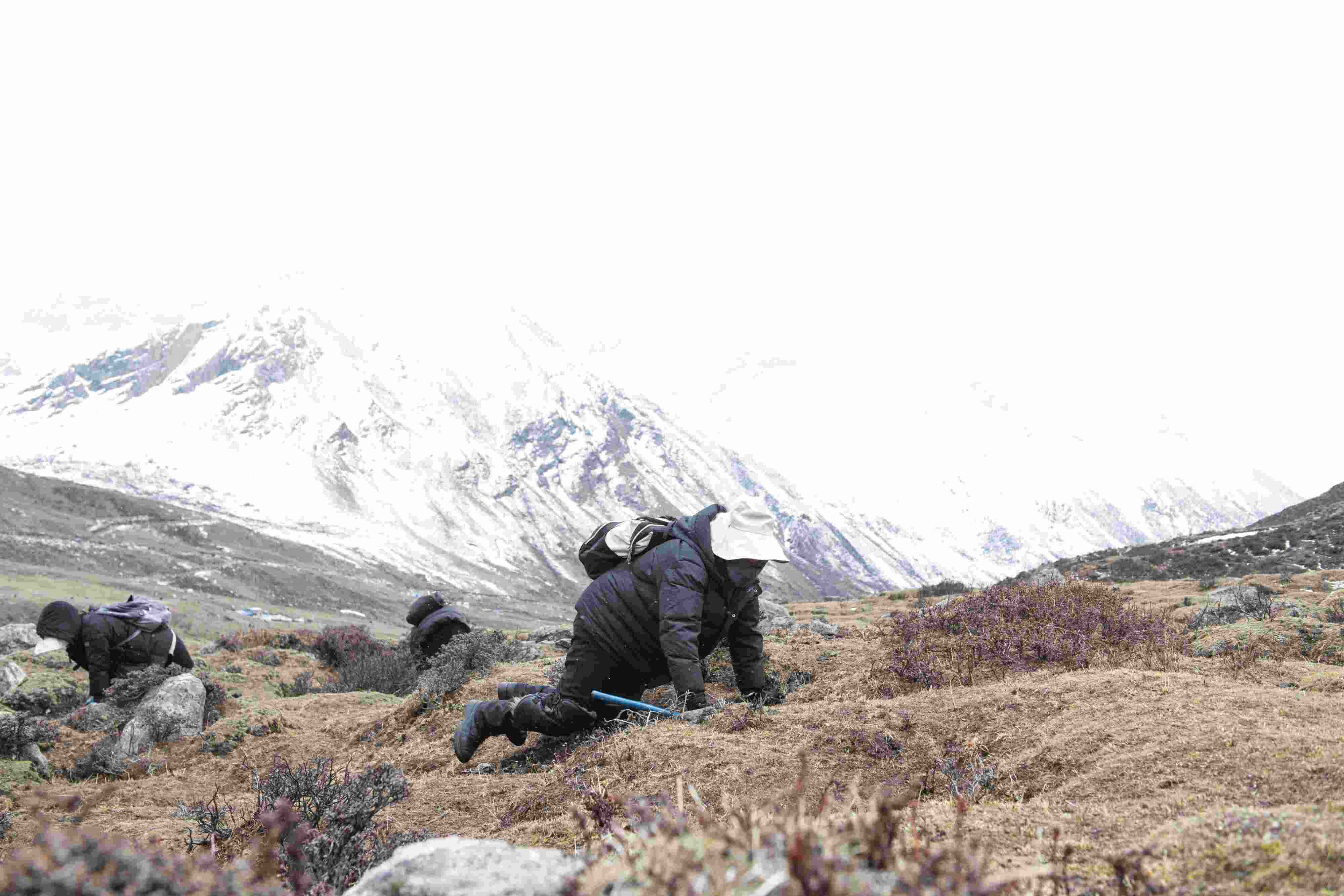 2023年5月7日,西藏山南,加查縣安繞鎮(zhèn)的村民在索囊溝采挖冬蟲夏草。 視覺中國