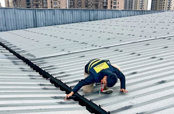 ▲“梅花”臺風(fēng)將至,2022年9月14日16時,人保財險浙江溫州永嘉支公司青年員工趕在臺風(fēng)前走訪重點企業(yè)開展防災(zāi)檢查。他不懼危險,爬上客戶廠房棚頂查看密封情況,只為確保廠房安全。