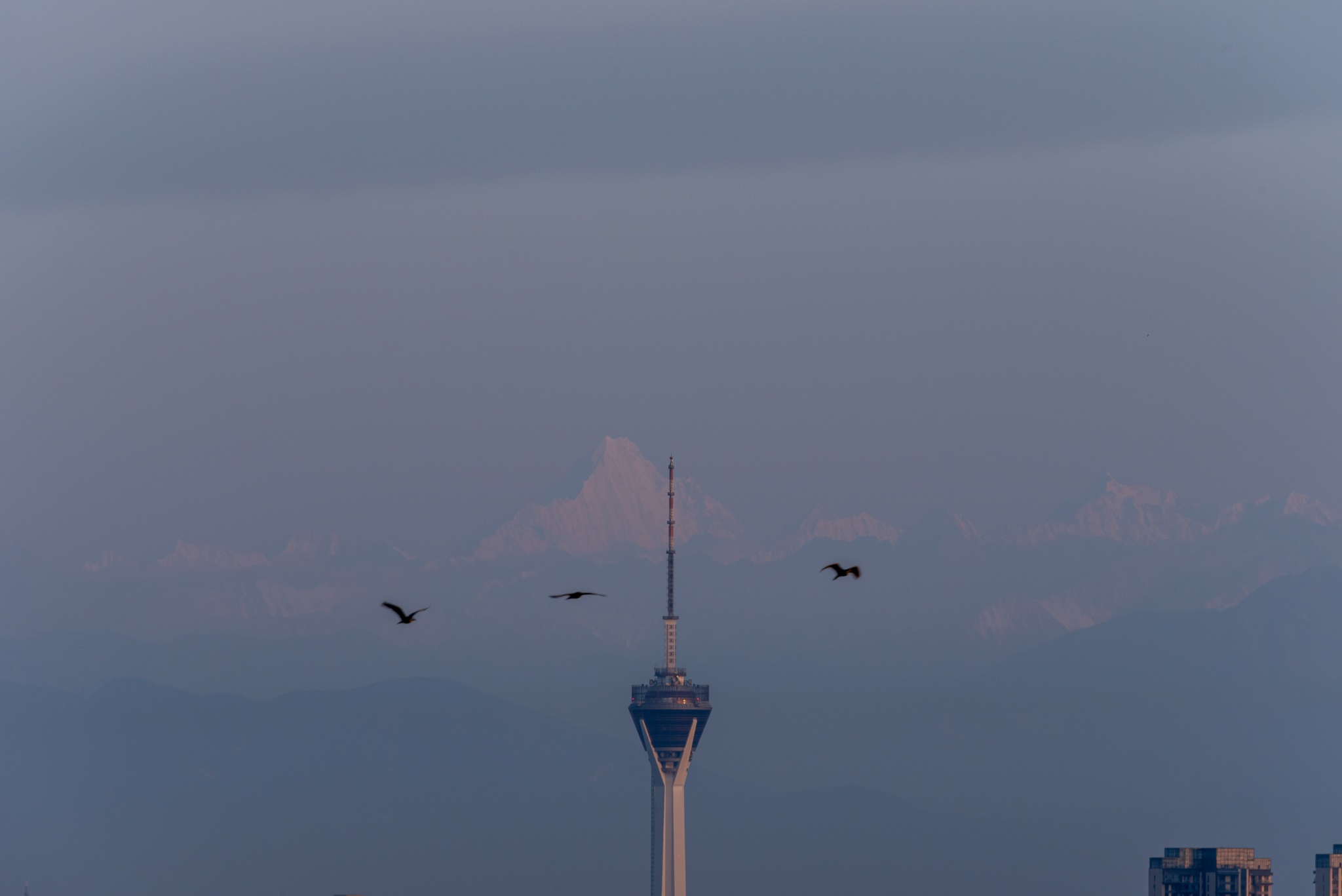 2023年5月13日,成都,幺妹峰露出真容,與城市建筑同框。視覺中國