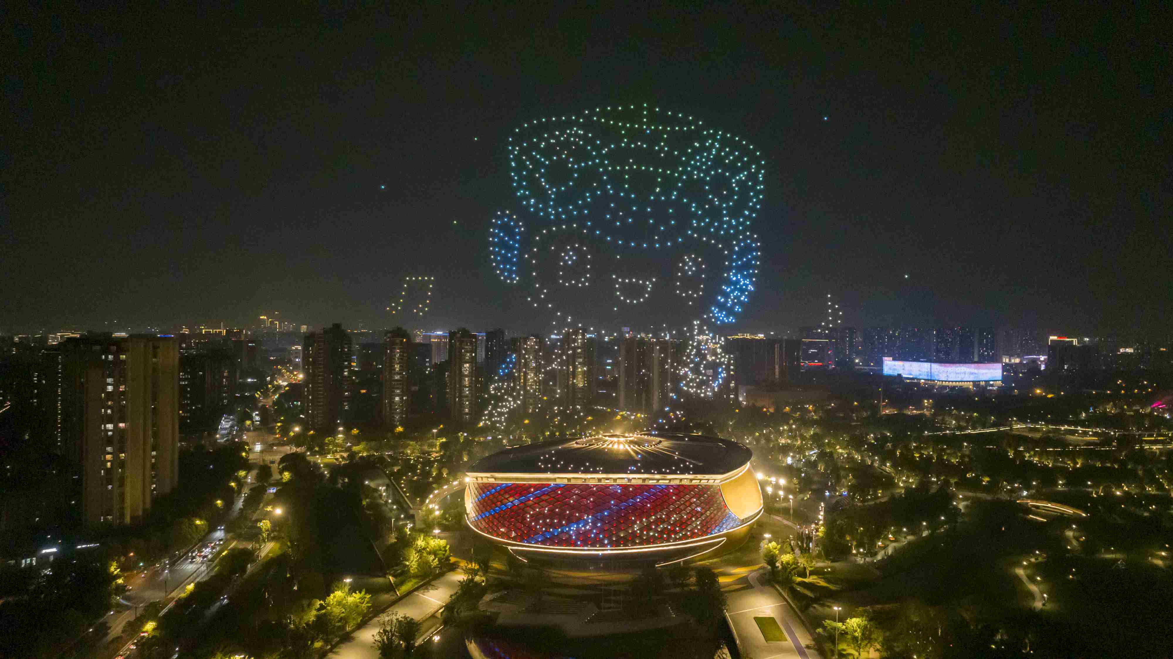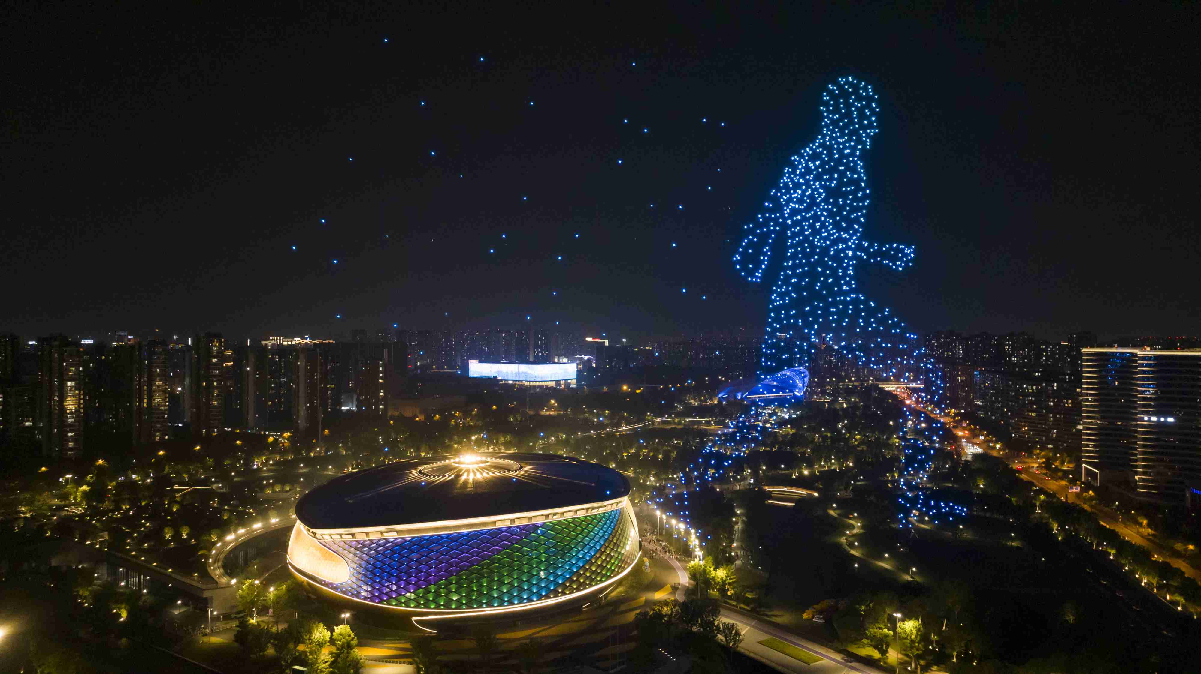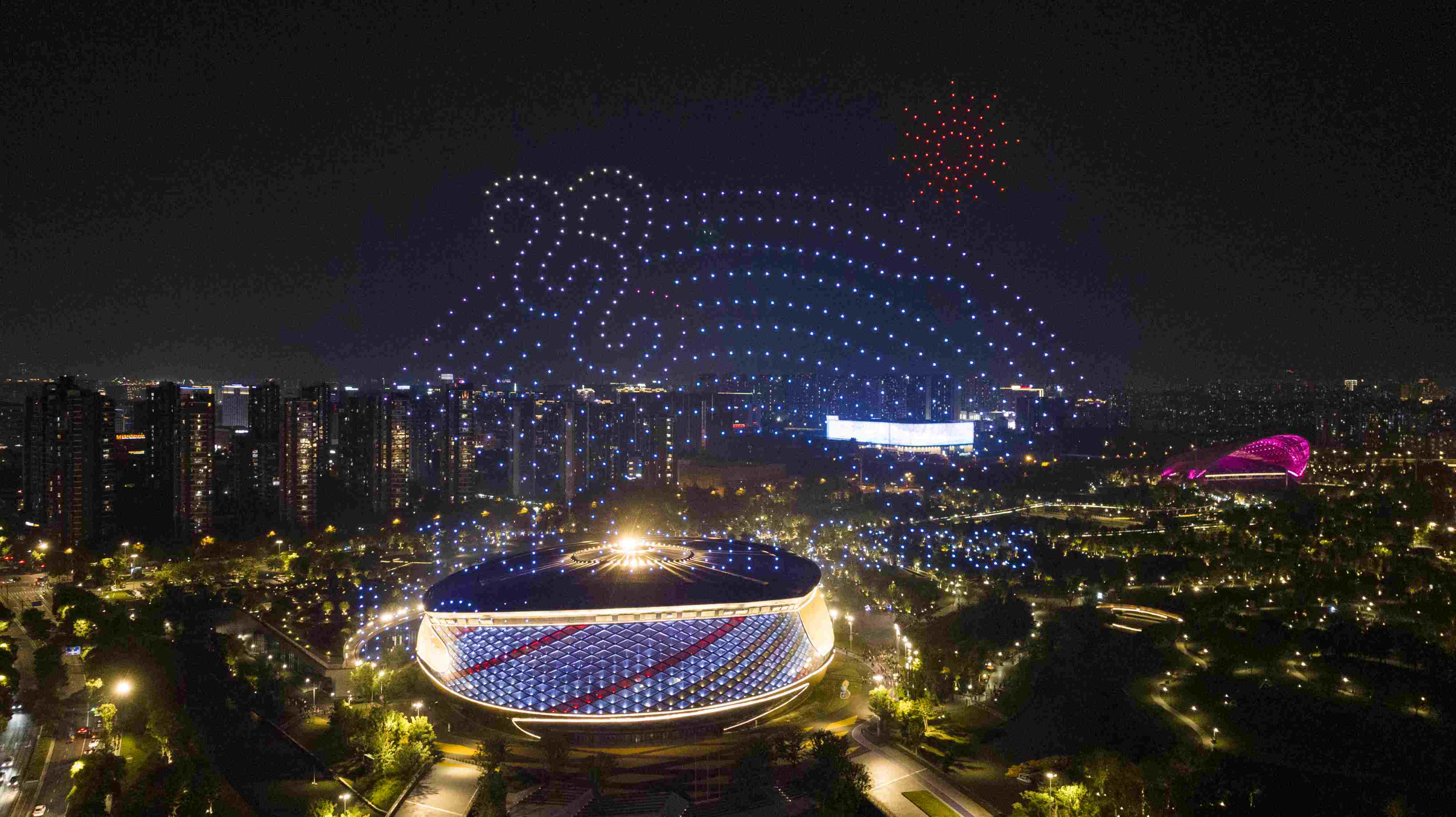 2023年5月13日,杭州亞運會乒乓球比賽場地——拱墅運河體育公園體育館上空上演無人機燈光秀表演。 視覺中國