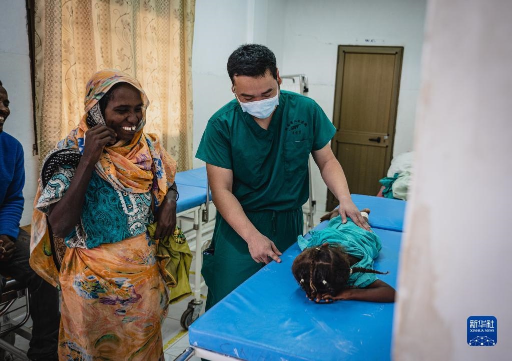 5月9日,在厄立特里亞首都阿斯馬拉的哈利貝特醫(yī)院,醫(yī)療隊骨科醫(yī)生程旭光為小朋友做檢查。