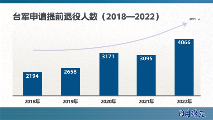 目前,臺(tái)軍實(shí)行以志愿役為主,義務(wù)役為輔的混合兵役制度。臺(tái)軍的主戰(zhàn)部隊(duì)由志愿役人員構(gòu)成,通過(guò)招募而來(lái)、至少服役4年,這次上熱搜的“申請(qǐng)?zhí)崆巴艘鄣?000多人”主要就是志愿役士兵。