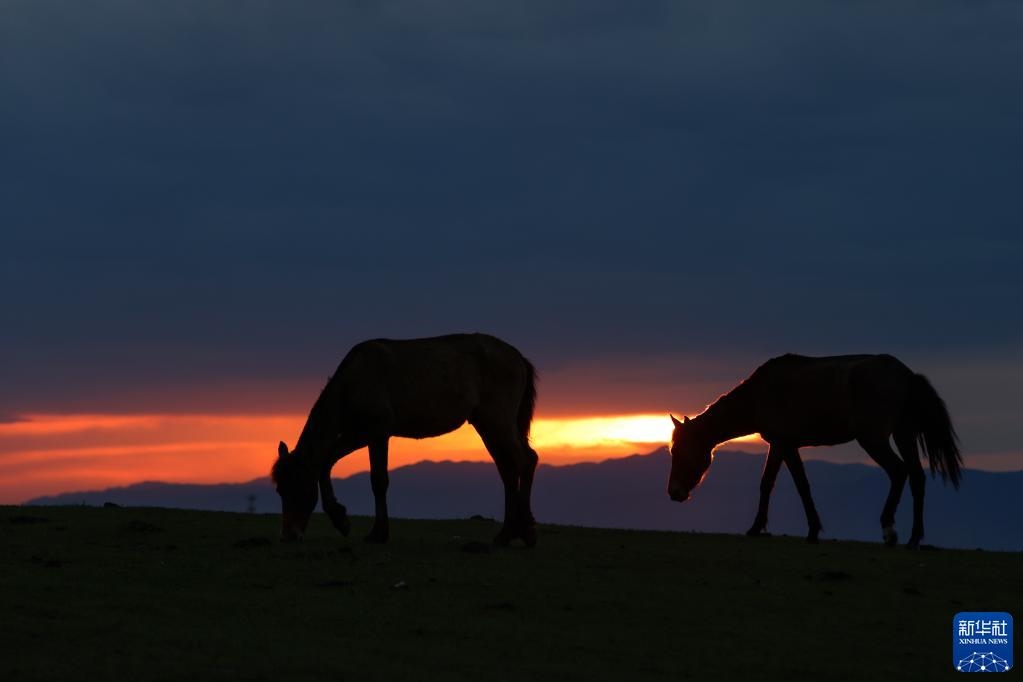 5月20日,夕陽(yáng)下的那拉提草原上,馬在吃草。