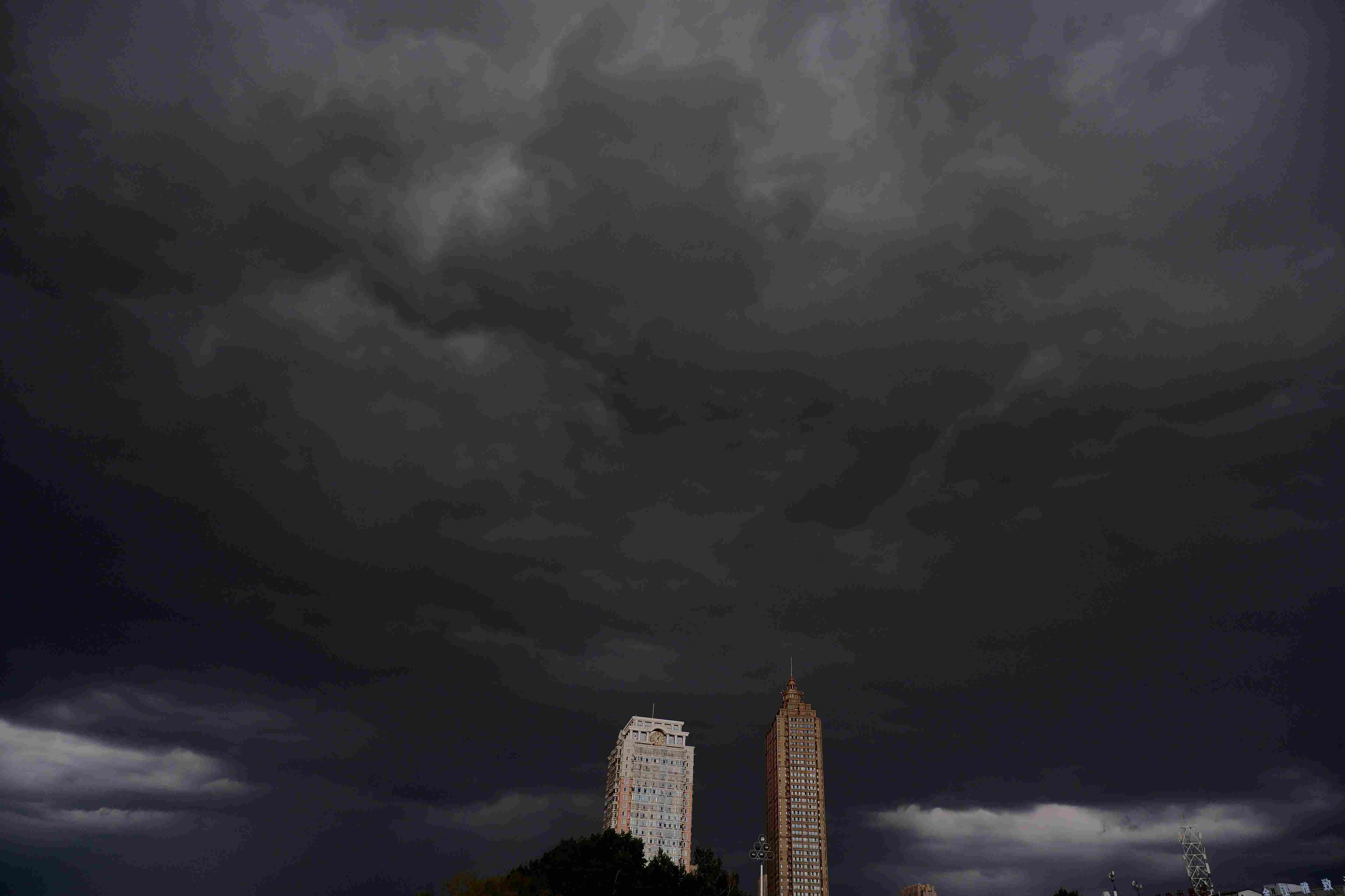 5月21日下午,黑龍江省哈爾濱市迎來強降雨天氣,整座城市被雷暴云籠罩,白晝?nèi)缫?,宛如上演科幻大片? (吳胡荼 攝)