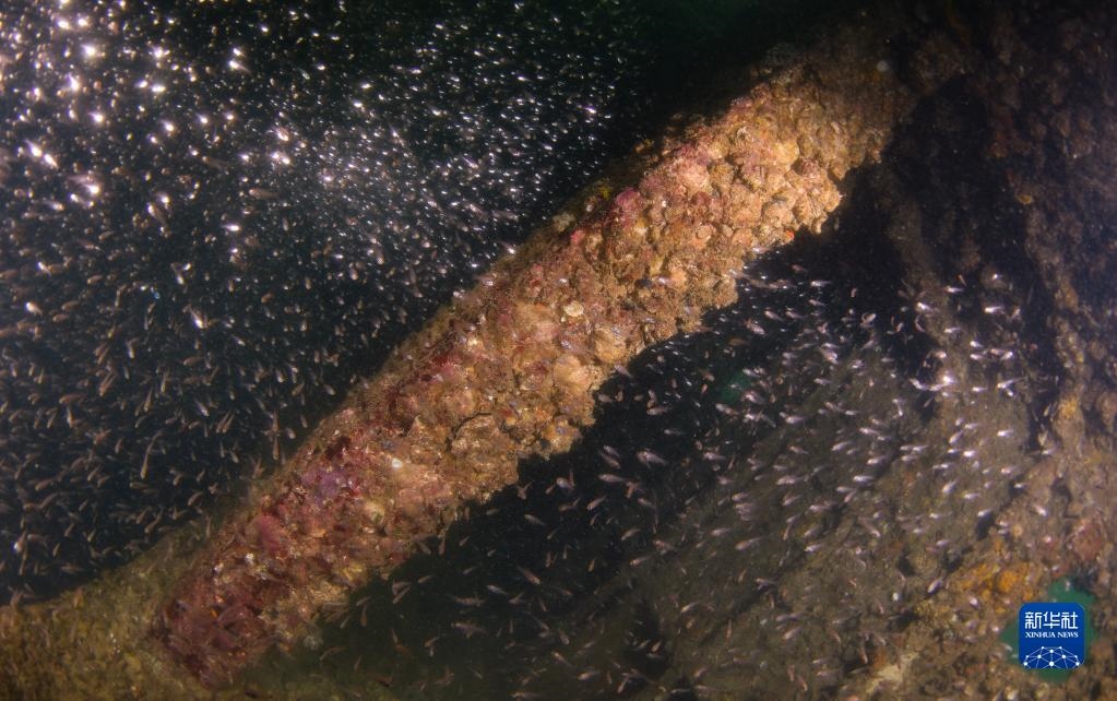 這是在蜈支洲島海域海洋牧場(chǎng)沉船魚礁內(nèi)拍攝的魚群(5月16日攝)。