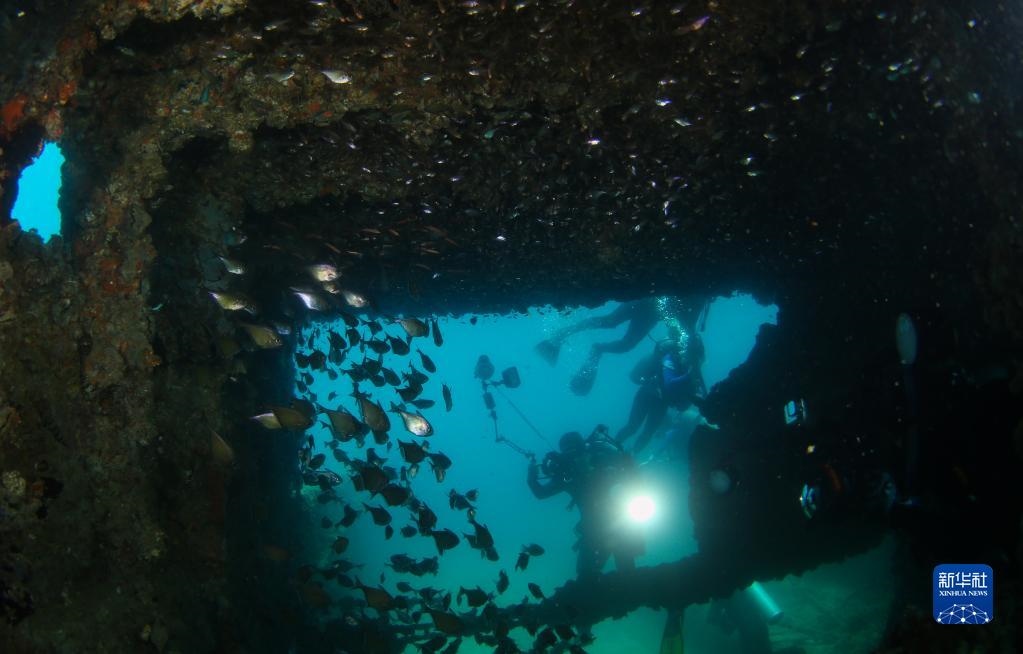 攝影愛好者在蜈支洲島海域海洋牧場(chǎng)拍攝沉船魚礁內(nèi)的魚群(2021年5月21日攝)。