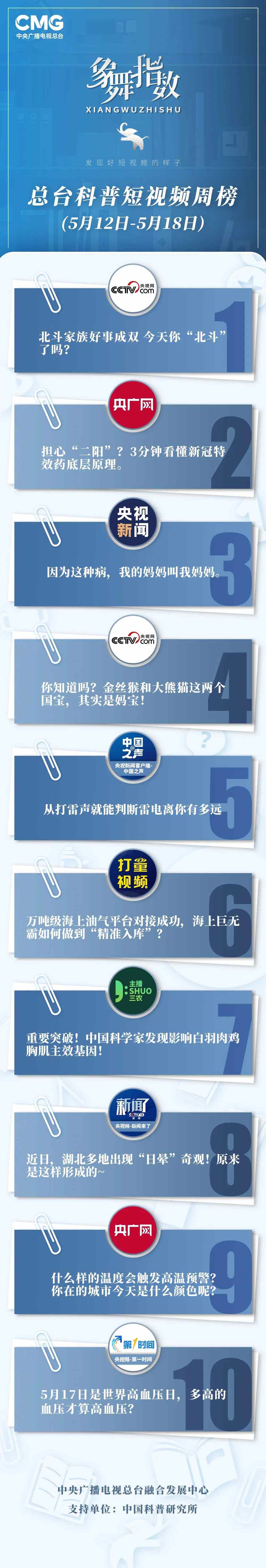 中央廣播電視總臺“象舞指數(shù)”評議品牌,推出科普短視頻周榜、總臺科普短視頻周榜。在2023年5月12日-5月18日,值得注目的內(nèi)容有: