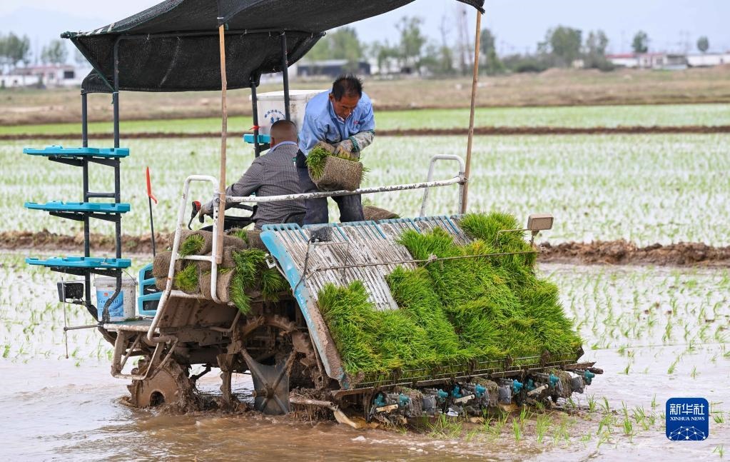 5月23日,達(dá)拉特旗昭君鎮(zhèn)村民在為農(nóng)機添加秧苗。
