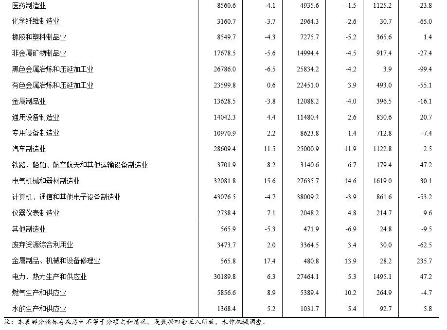 1—4月份,在41個工業(yè)大類行業(yè)中,13個行業(yè)利潤總額同比增長,1個行業(yè)持平,27個行業(yè)下降。主要行業(yè)利潤情況如下:電力、熱力生產(chǎn)和供應(yīng)業(yè)利潤總額同比增長47.2%,電氣機械和器材制造業(yè)增長30.1%,通用設(shè)備制造業(yè)增長20.7%,汽車制造業(yè)增長2.5%,石油和天然氣開采業(yè)下降6.0%,專用設(shè)備制造業(yè)下降7.4%,煤炭開采和洗選業(yè)下降14.6%,非金屬礦物制品業(yè)下降27.4%,紡織業(yè)下降30.2%,農(nóng)副食品加工業(yè)下降36.3%,計算機、通信和其他電子設(shè)備制造業(yè)下降53.2%,有色金屬冶煉和壓延加工業(yè)下降55.1%,化學(xué)原料和化學(xué)制品制造業(yè)下降57.3%,石油、煤炭及其他燃料加工業(yè)下降87.9%,黑色金屬冶煉和壓延加工業(yè)下降99.4%。