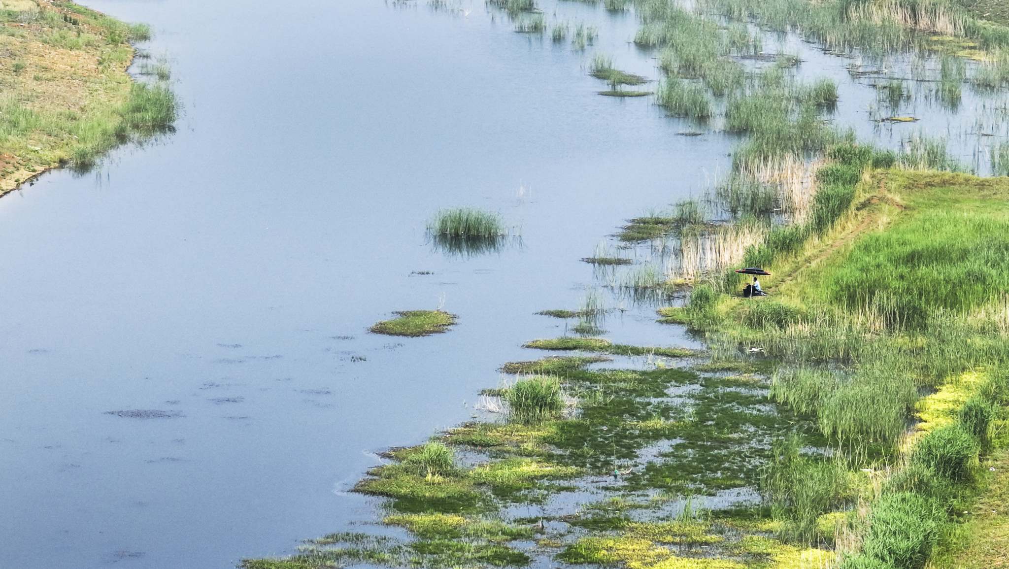 2023年5月31日,山東棗莊,薛城區(qū)蟠龍河國家濕地公園綠意盎然、流水潺潺、水鳥翩躚而至,繪就一幅美麗的生態(tài)畫卷。視覺中國