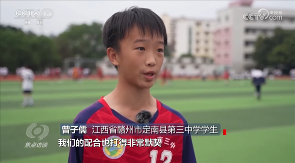 江西省贛州市定南縣第三中學學生曾子儒:“踢足球之前自己體弱多病,身體素質比較差,別提去踢這么一場激烈的足球比賽,就是讓我圍著操場跑一圈都氣喘吁吁。”