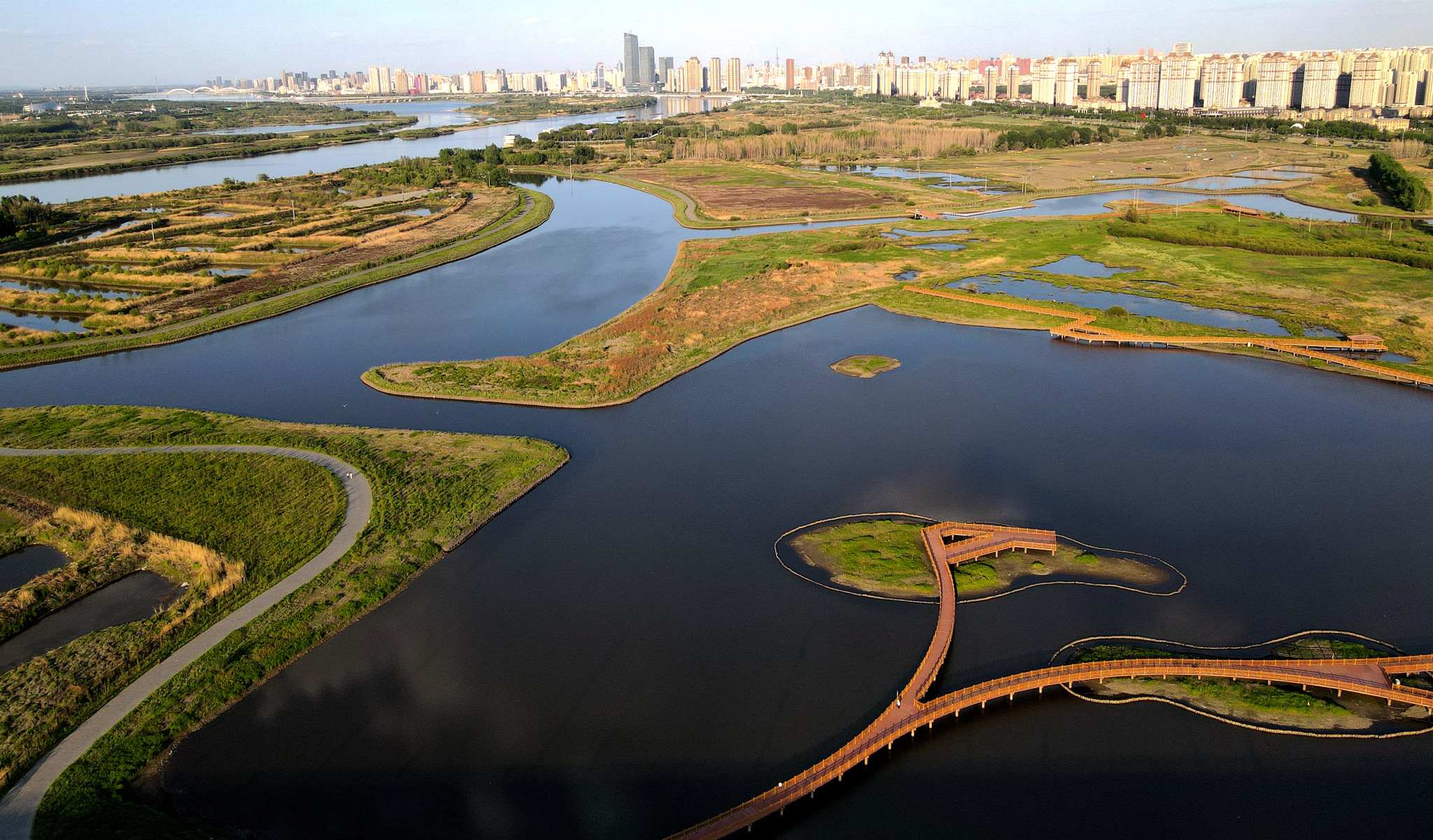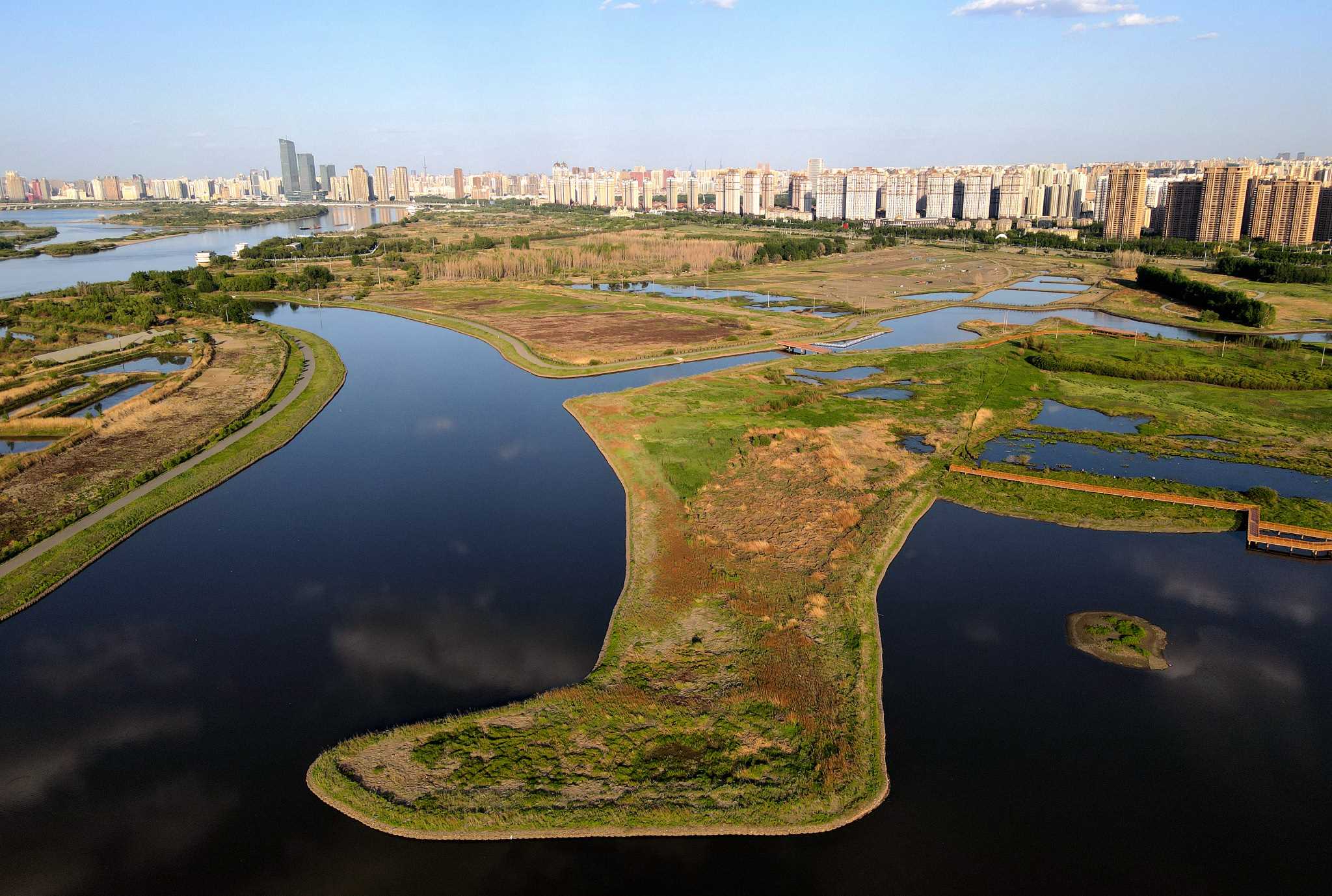 2023年5月30日,哈爾濱,松花江畔,外灘濕地中,“靴子”小島草木茂盛,綠意盎然。視覺(jué)中國(guó)