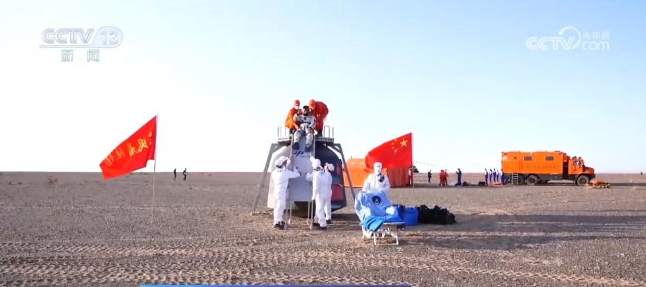 總臺記者 郭靜:在返回艙降落后處于直立狀態(tài)時(shí),我旁邊的這個(gè)操作平臺就發(fā)揮了大作用,它采用鎂鋁合金材質(zhì),相較之前更加輕便了,處置隊(duì)員從飛機(jī)降落后到搭建好操作平臺也就需要5分鐘左右的時(shí)間。除了輕便以外呢,它的滑梯坡度也更加平緩了,航天員下滑時(shí)也會更加舒適。