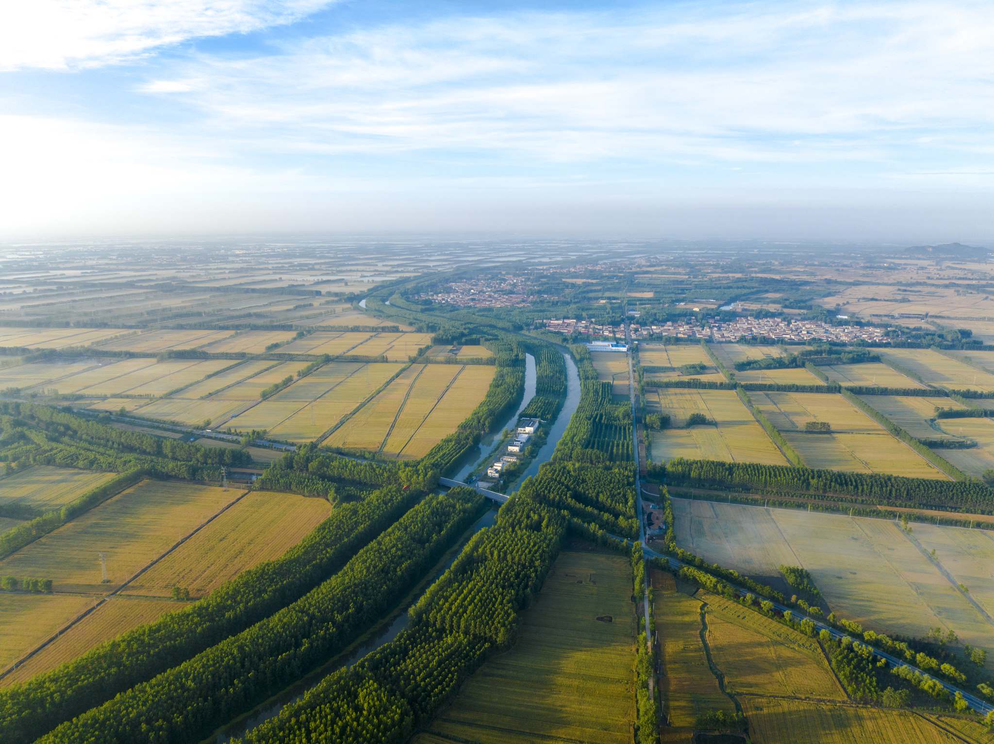 2023年6月3日,江蘇連云港,東??h,金色田野與村莊、道路、河流共同構(gòu)成了一幅秀美的夏日豐收畫卷。視覺中國(guó)
