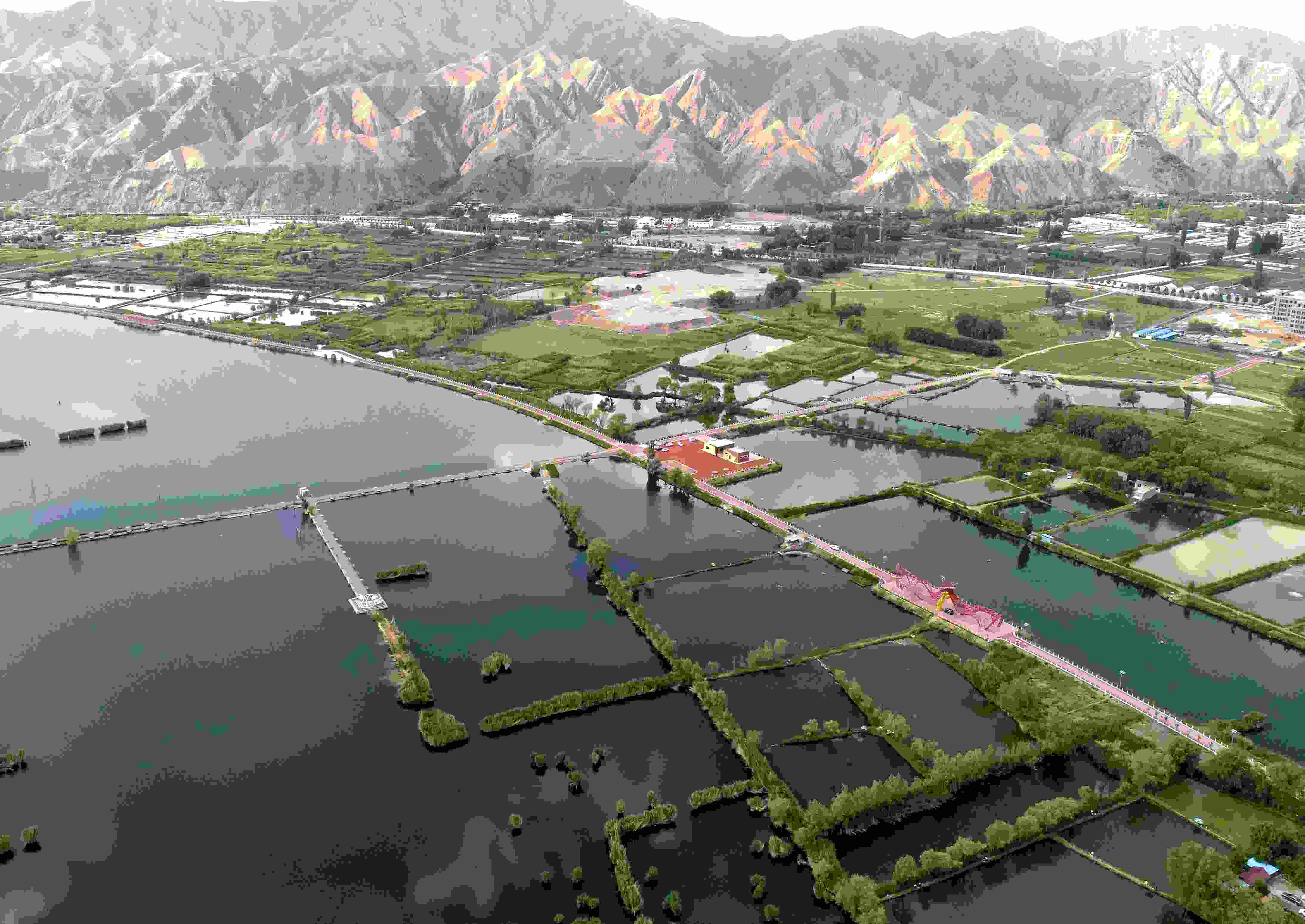 初夏時(shí)節(jié),甘肅省永靖縣太極島黃河濕地風(fēng)光秀麗,島上蘆草叢生,綠意盎然,游客乘船在蘆葦蕩里游玩。沿河公路與狹長(zhǎng)的黃河交相輝映,星羅棋布的人工魚(yú)塘宛如一塊塊玉石鑲嵌在大地上,勾勒出一幅美妙的山水田園畫(huà)卷。近年來(lái),永靖縣依托太極島黃河濕地豐富的生態(tài)資源,將文旅產(chǎn)業(yè)與生態(tài)保護(hù)相結(jié)合,進(jìn)一步提升水產(chǎn)養(yǎng)殖、濕地保護(hù)以及休閑旅游功能。