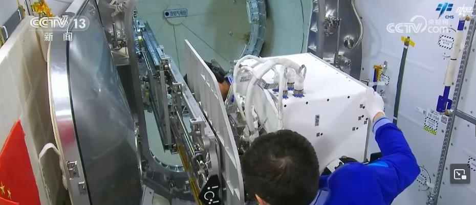 這是3位航天員正在夢(mèng)天實(shí)驗(yàn)艙進(jìn)行空間輻射生物學(xué)暴露實(shí)驗(yàn)裝置出艙工作,航天員將載荷安裝到載荷轉(zhuǎn)移機(jī)構(gòu)。載荷出艙前,航天員在反復(fù)仔細(xì)檢查,隨后,關(guān)閉夢(mèng)天實(shí)驗(yàn)艙貨物氣閘艙艙門。通過(guò)該裝置開(kāi)展空間粒子輻射等環(huán)境要素,對(duì)樣本材料生物學(xué)效應(yīng)的研究,為科學(xué)實(shí)驗(yàn)生物樣品提供生命保障。