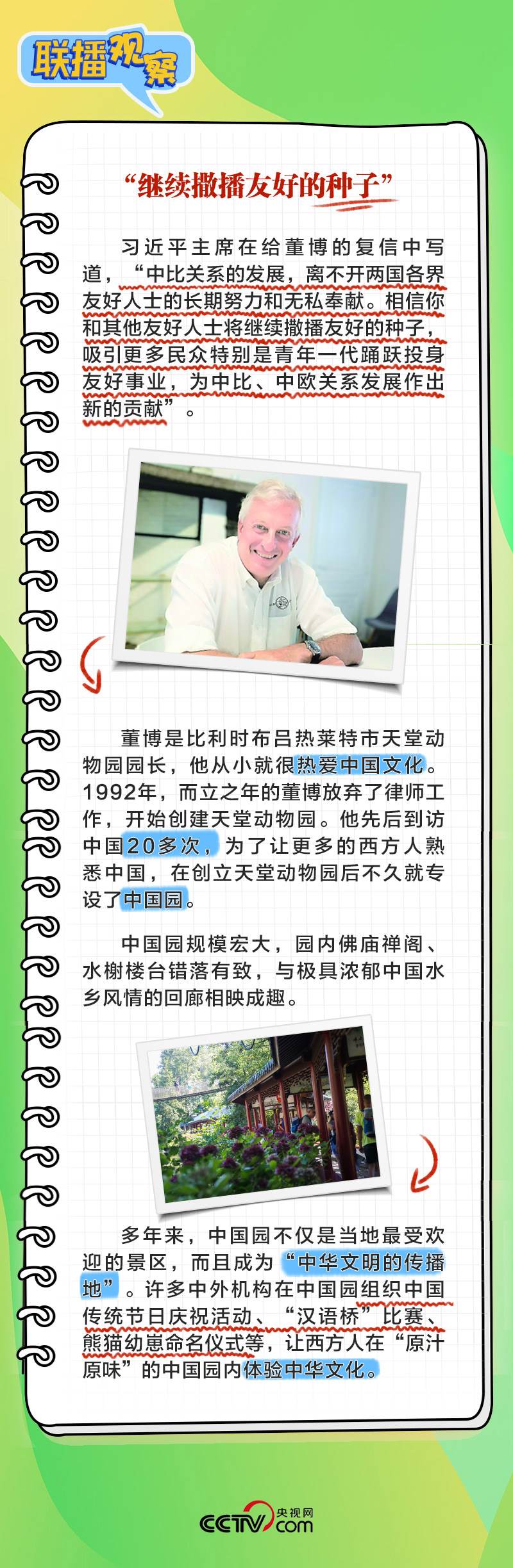 董博是比利時布呂熱萊特市天堂動物園園長,他在給習(xí)主席致信中回顧了習(xí)主席和夫人彭麗媛2014年3月訪比期間出席天堂動物園大熊貓園開園儀式的情景,表示中國園體現(xiàn)人與自然和諧共生理念,中國夢和中國的發(fā)展繁榮永遠(yuǎn)是可共享的機(jī)遇。