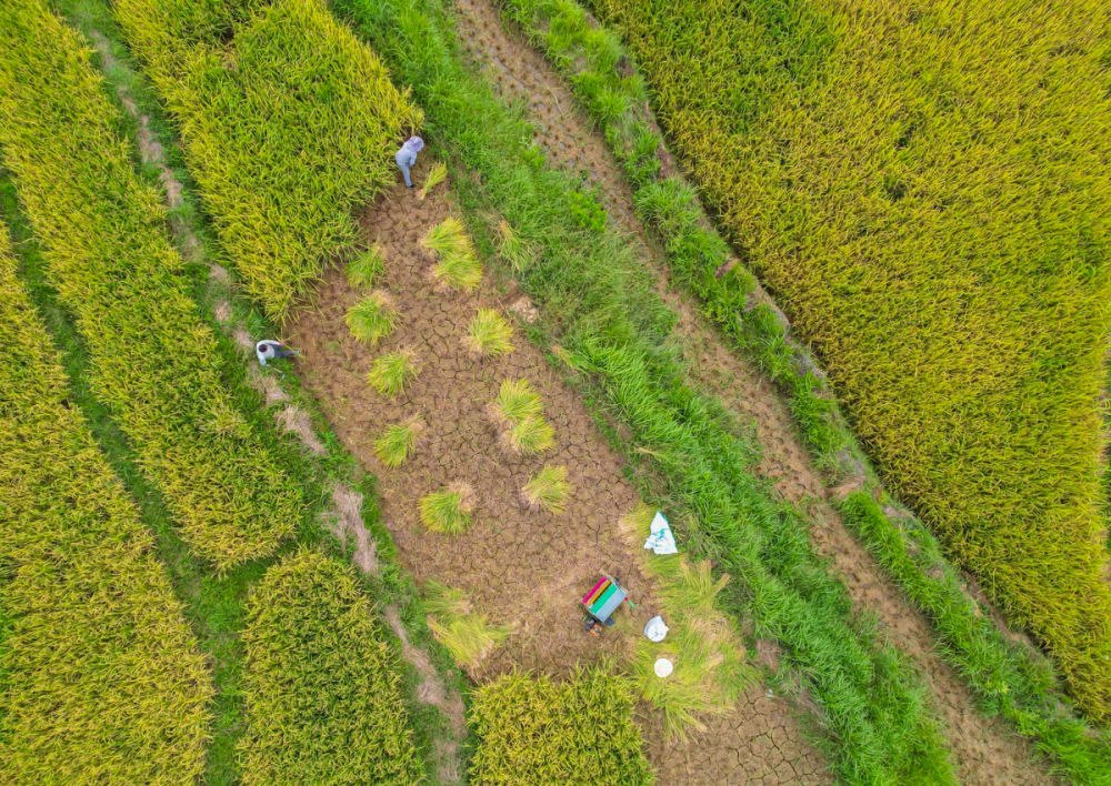 ↑2023年9月4日,湖南省東安縣舜皇山國家森林公園管理局塘家梯田,農(nóng)民在收割稻谷。CICPHOTO/嚴潔 攝