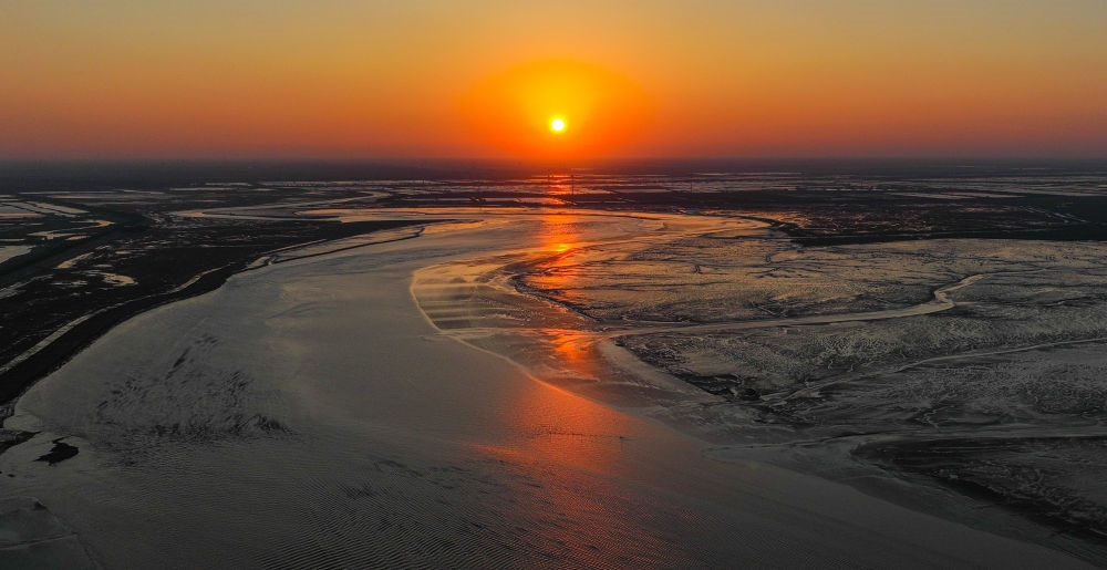 這是鹽城東臺(tái)條子泥濕地日出景色(9月1日攝,無(wú)人機(jī)照片)。
