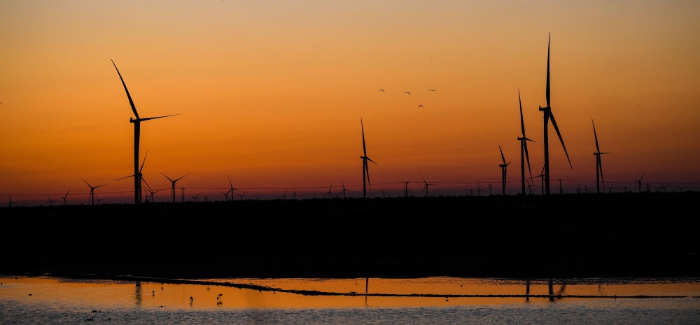 落日時(shí)分拍攝的東臺(tái)沿海經(jīng)濟(jì)區(qū)風(fēng)力發(fā)電機(jī)組(無(wú)人機(jī)照片,8月31日攝)。