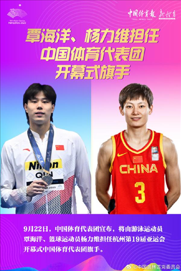 9月22日上午,中國體育代表團宣布,將由游泳運動員覃海洋、籃球運動員楊力維擔任杭州亞運會開幕式中國體育代表團旗手。