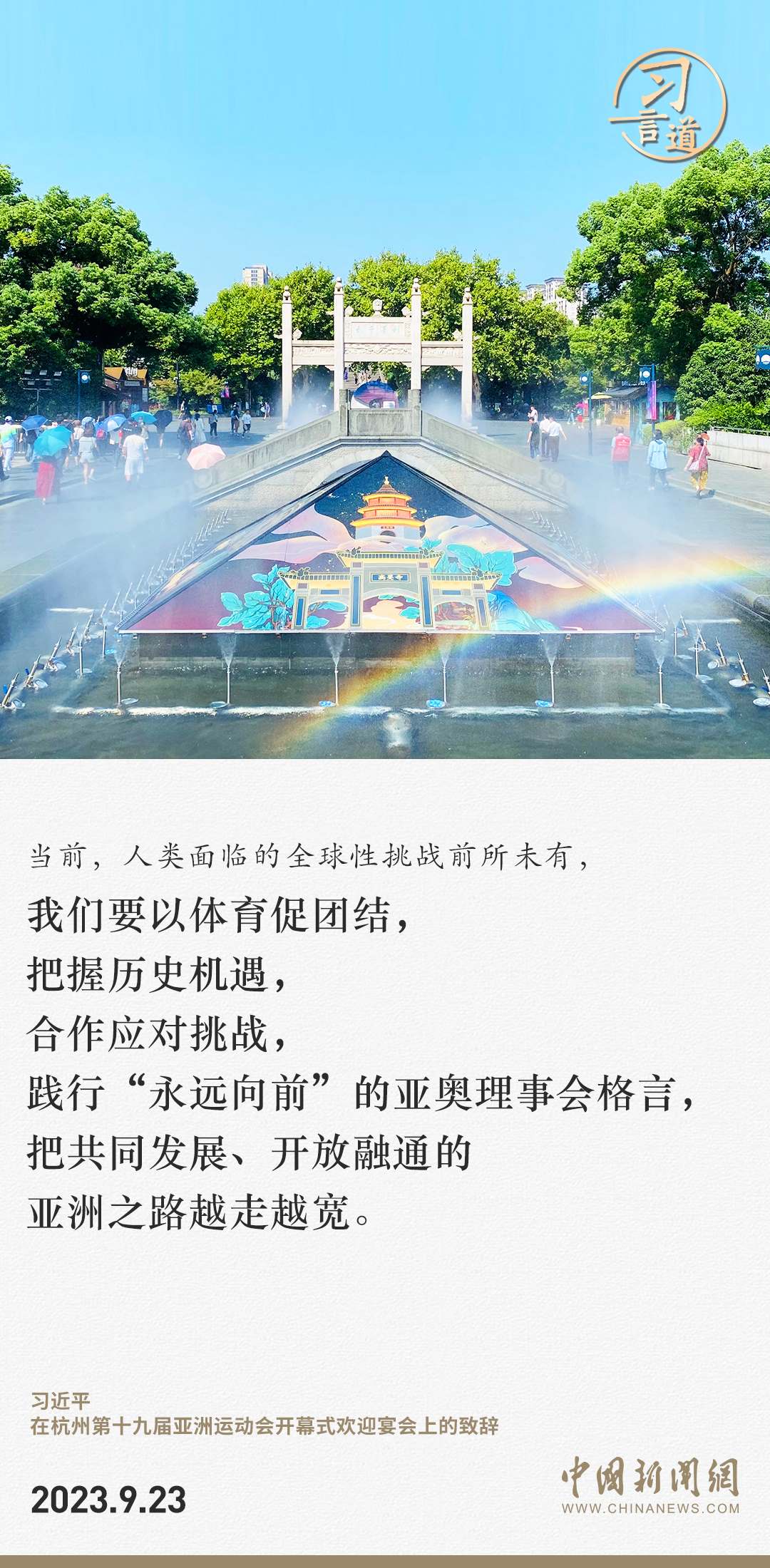 9月23日中午,國家主席習近平和夫人彭麗媛在浙江省杭州市西子賓館舉行宴會,歡迎來華出席杭州第19屆亞洲運動會開幕式的國際貴賓。習近平發(fā)表致辭指出——