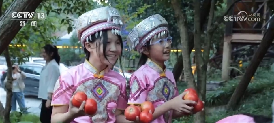 隨著歡快的音樂響起,當(dāng)?shù)卮迕翊┥仙术r艷的節(jié)日盛裝,踏著鼓點,圍著篝火跳起土家擺手舞,豐收的喜悅洋溢在村民們的臉上,游客們加入其中,大家手牽著手,共同舞出金秋和美鄉(xiāng)村新畫卷。